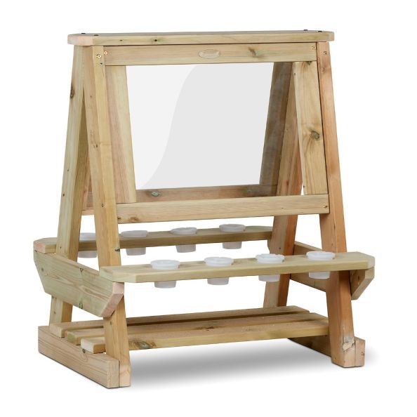 Sturdy, double-sided art easel with mark making surface on both sides and lower level storage shelf. Includes 8 clear pots for holding brushes etc. Ideal for group play and taller/older children.