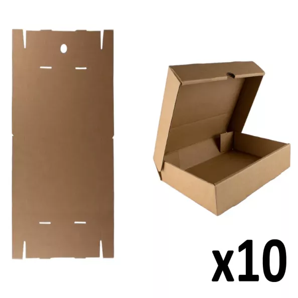 A4 Flat-pack storage box - Pack of 10 Extremely rigid cardboard storage boxes Supplied flat - Easy to assemble Kraft lined outer Individual internal size approx: 335 x 235 x 60mm Individual external size approx: 350 x 255 x 65mm