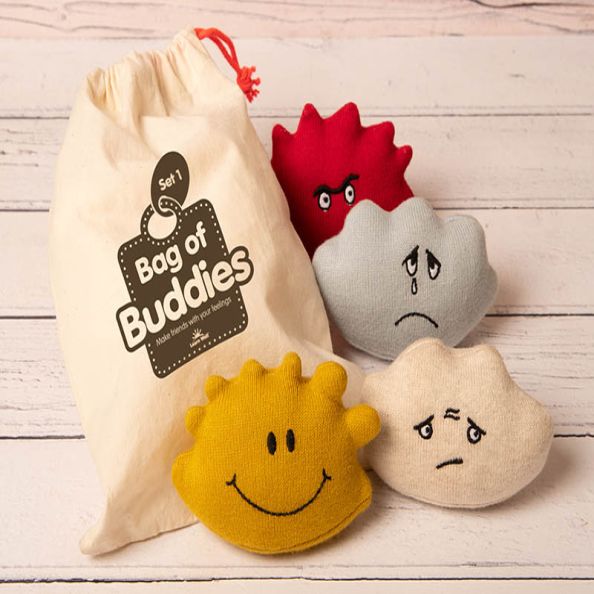 Bag of Buddies - Set 1. Make friends with your feelings! Sometimes giving a child something to talk through helps unlock their emotions. These charming little characters are small enough to sit in the palm of your hand. Set of 4 washable characters in a drawstring bag with practitioner notes to provide guidance and support.