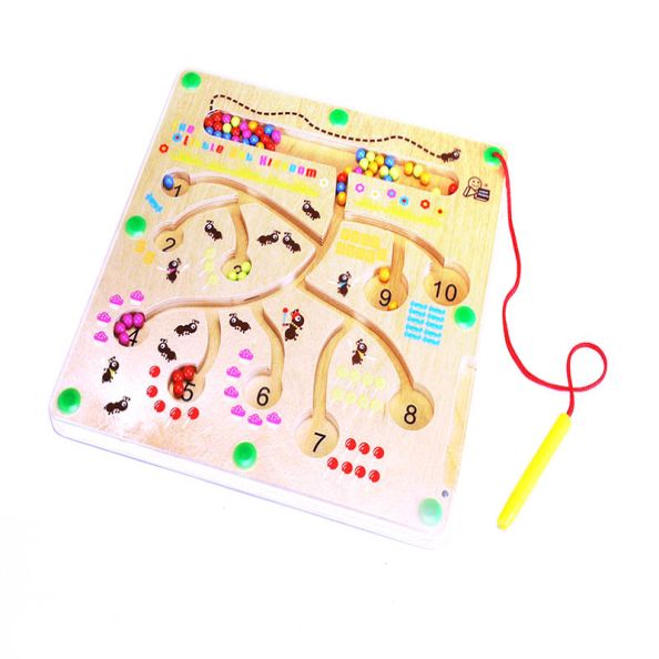 The board contains coloured balls which are moved across the maze under the clear plastic cover using pencils. These pencils have a magnet in their tip, but are held by the child using the same tripod grasp which they would use to hold a regular pencil.