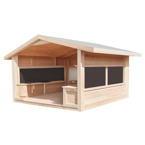 Three-sided space is a perfect resource for outdoor learning. With plenty of space for mark-making on the chalkboard walls. This space is perfect for endless hours of fun, communication, and teaching. Size: L2.4 x W2.4m. Eaves height: 2.1m