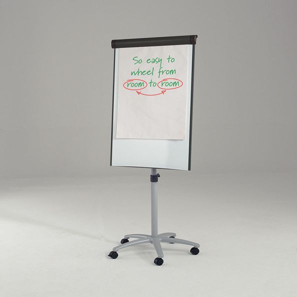 Magnetic whiteboard. Height adjustable. Two arms supplied as standard for hanging completed sheets. Full width pen tray. Board Size 1000x680mm. Max height 1820mm. Grey base cover