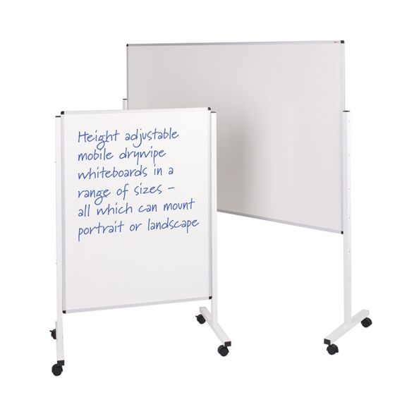 Double sided mobile drywipe whiteboard. White anodised aluminium frame with locking castors. Height adjustable panels that can be mounted portrait or landscape. Double sided whiteboard with one side plain and the reverse with a feint grid.