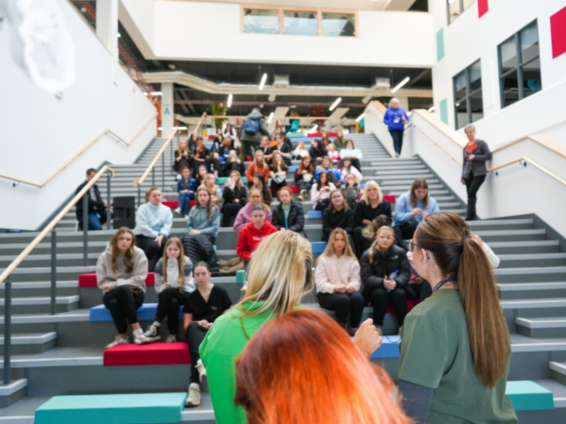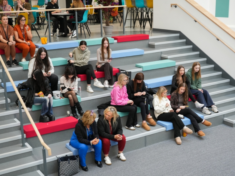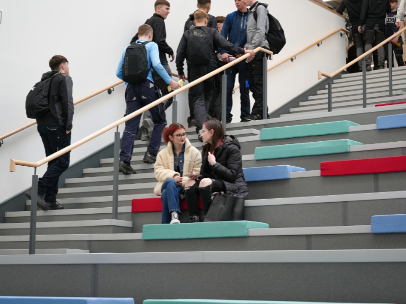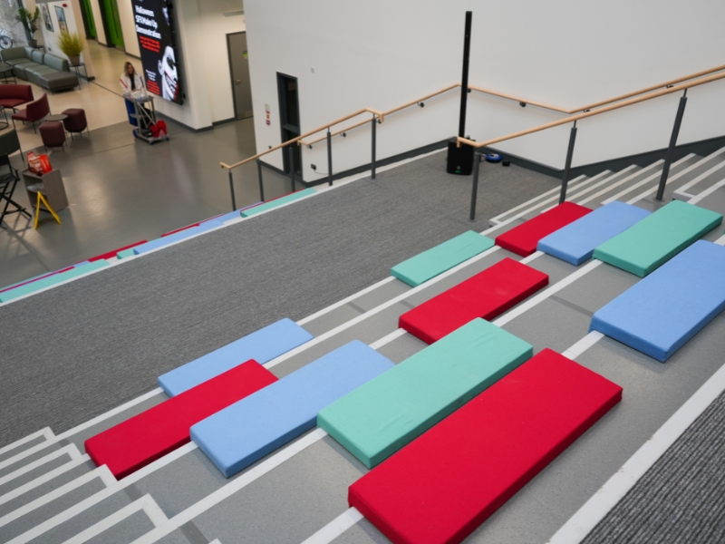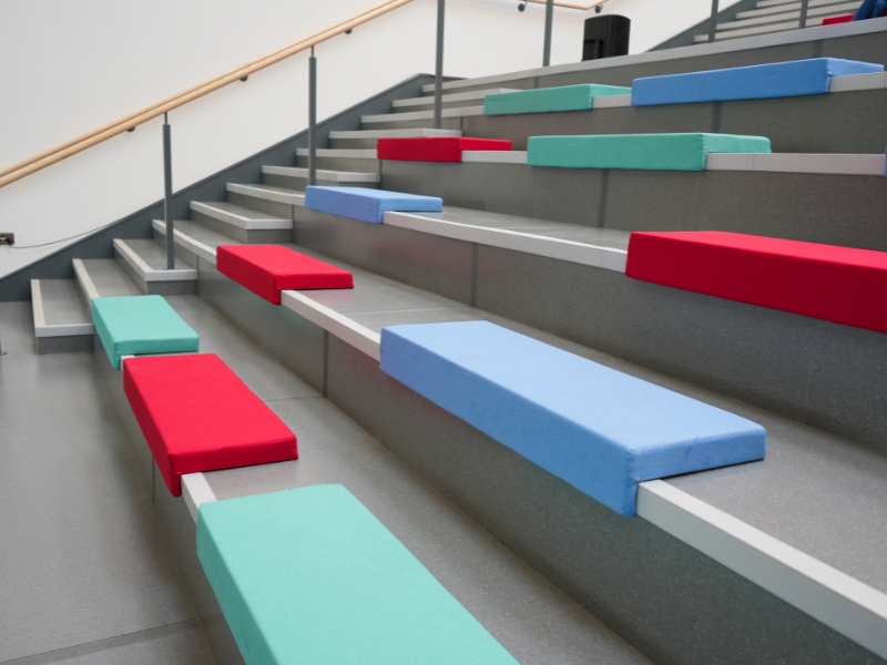 The colourful cushions and open design invite students to relax, gather, and collaborate throughout the day. Whether it’s catching up with friends before class, unwinding during breaks, or taking part in group activities, the staircase has quickly become a central meeting point within the college.