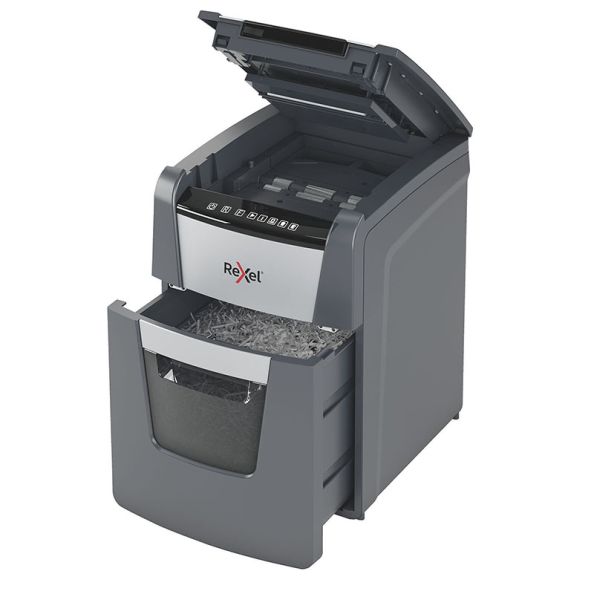 The Rexel Optimum Auto Feed+ 100X cross cut shredder automatically shreds up to 100 A4 sheets of paper (80gsm) at a time into P4 (4x28mm) cross cut pieces.