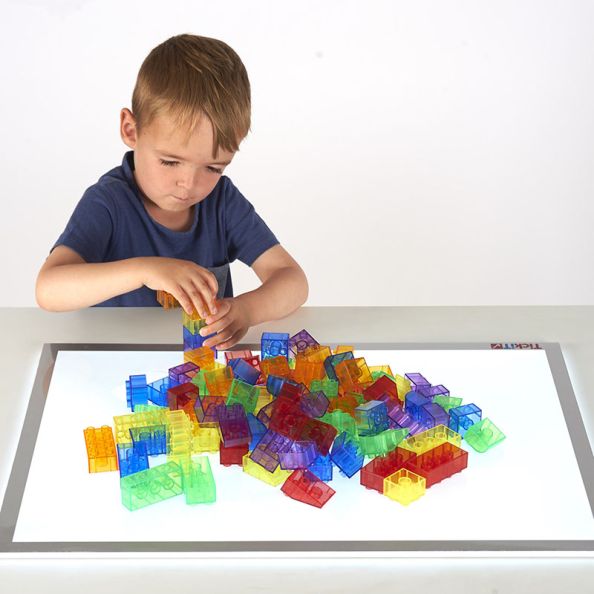 Translucent plastic building blocks, ideal for improving fine motor skills through imaginative play. Colourful constructions look even more striking when built on a light panel. Comes in a convenient storage container.